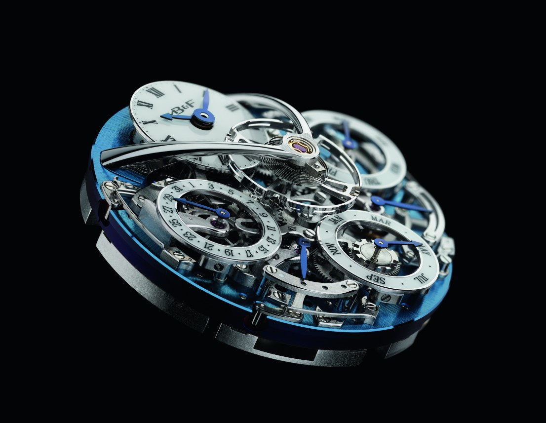 Благодаря применению новаторской системы индикации, разработанной специально для Legacy Machine Perpetual, создается ощущение, что указатели парят над механизмом без видимой опоры. На самом деле эти скелетонизированные индикаторы установлены на скрытые колонки. Такое решение было бы невозможно реализовать в традиционном механизме вечного календаря типа «grand levier» – они бы заблокировали его работу.