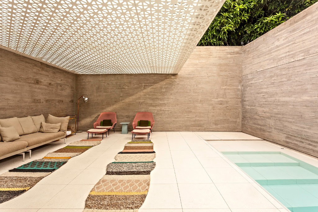 Структура здания разворачивается вокруг двенадцати патио, каждое из которых решено в индивидуальном стиле. Роскошная растительность и мерцающая бирюзовая гладь бассейнов уютных внутренних двориков сулят гостям релаксацию в превосходной степени. Решетки машрабия, примененные на фасадах в качестве выдвижных навесов, создают атмосферную игру света и тени. Отдавая дань традиционной арабской архитектуре, решетки создают живописный контраст с поверхностями из необработанного бетона, который был выбран Марио Фигероа в качестве основного материала здания.